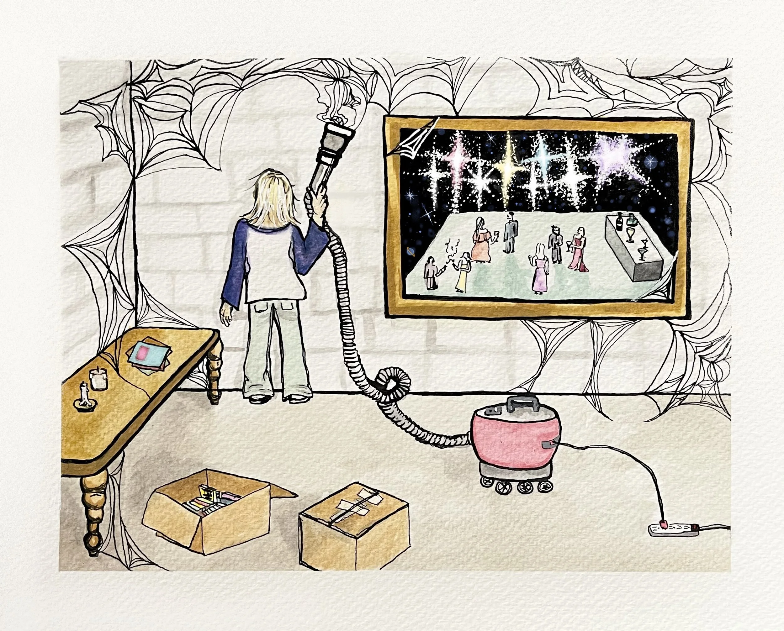 Pre-painting Spiderweb Vacuum, 2021, ink and gouache, 5x7